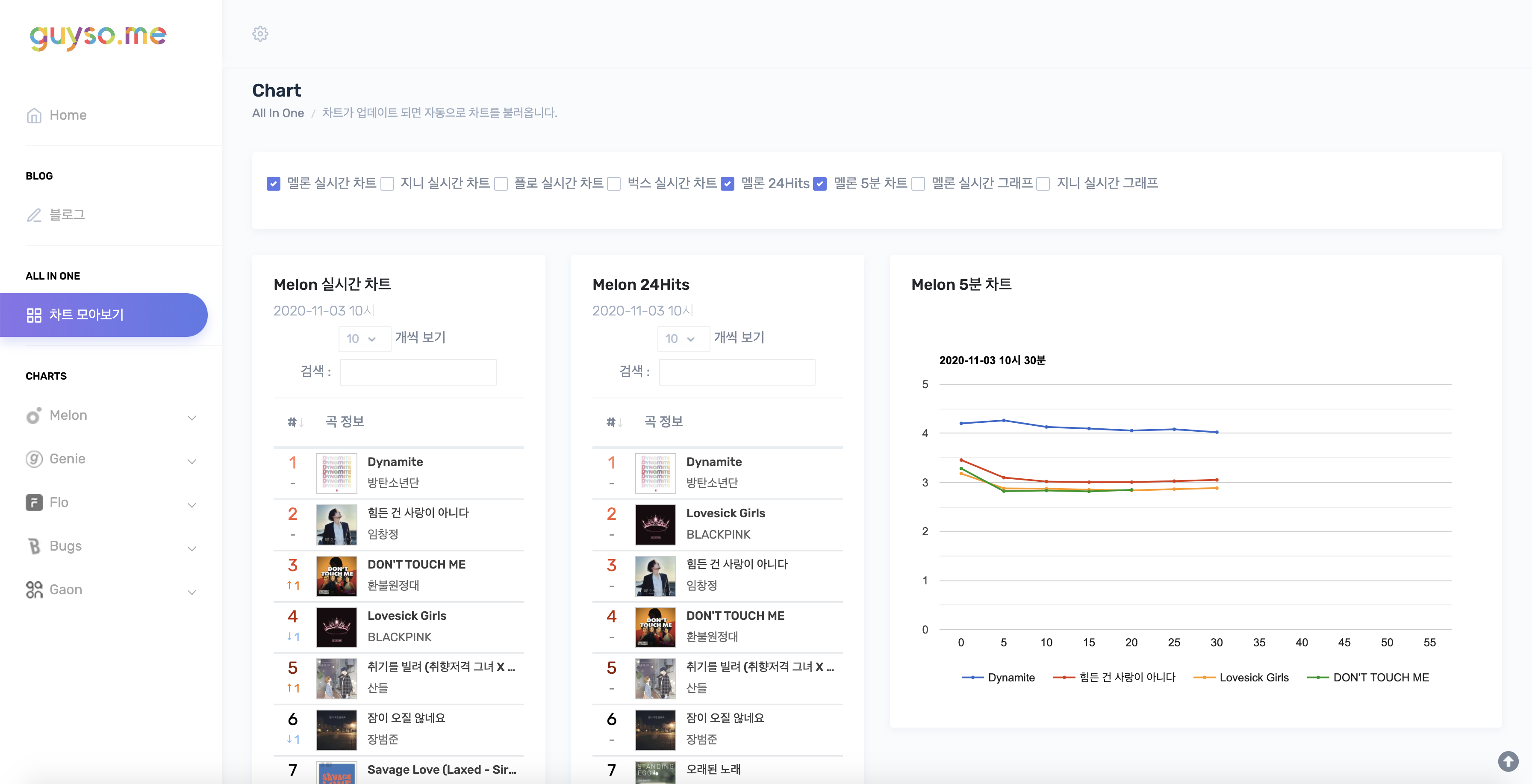 - 원하는 차트를 체크박스를 통해 선택할 수 있습니다.
